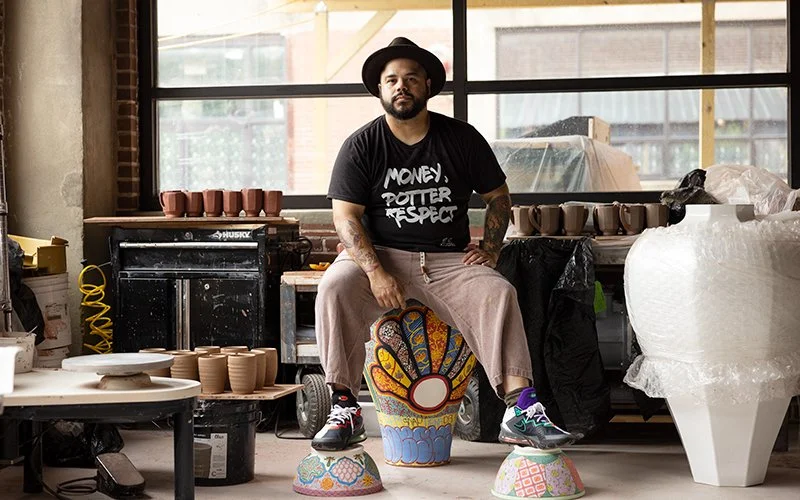 A community advocate known as “The Village Potter,” Lugo scales from sidewalk wheel demos to major museums, where his work reframes luxury objects as platforms for representation. Recent projects include the immersive solo The Village Potter at Grounds For Sculpture and the community-driven We Here—paired with a bilingual children’s book encouraging young artists.
